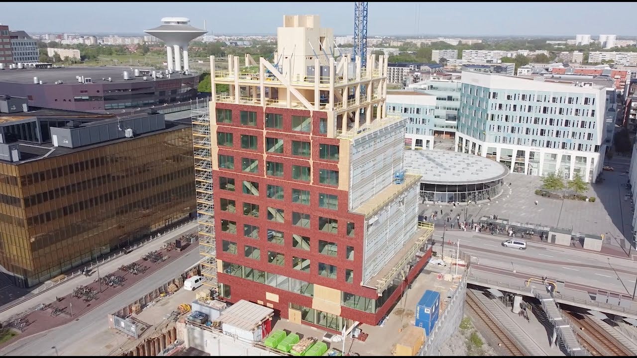 Більшість сучасних дерев’яних веж мають бетонне ядро для стійкості, але офісна вежа Fyrtornet від бюро Wingårdhs підіймається на вражаючу висоту 51,5 м, використовуючи лише деревину (за винятком фундаменту). Це підкреслює екологічні можливості дерев’яного будівництва.